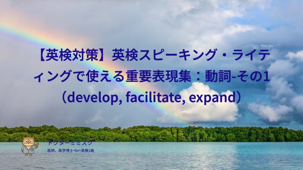 英検のスピーキングとライティングは、英語表現のアウトプットの試験です。読んだり聞いて簡単に理解できる表現でも自分でアウトプットができるとは限りません。そこには大きな壁があります。ここが、スピーキングとライティングの難しさ … 続きを読む 【英検対策】英検スピーキング・ライティングで使える重要表現集:動詞-その1(develop, facilitate, expand)